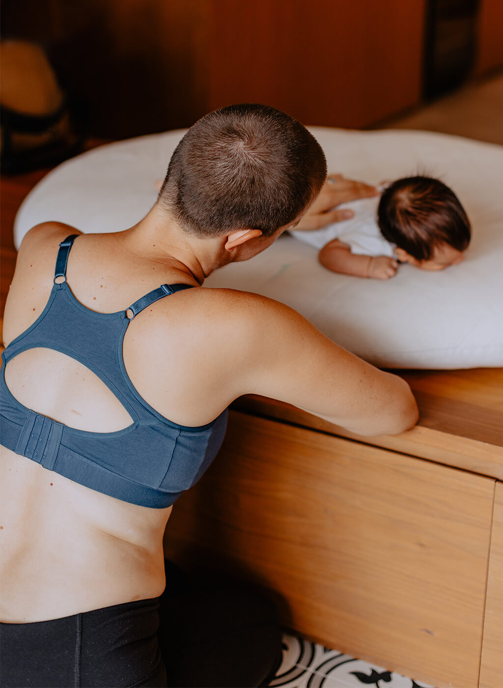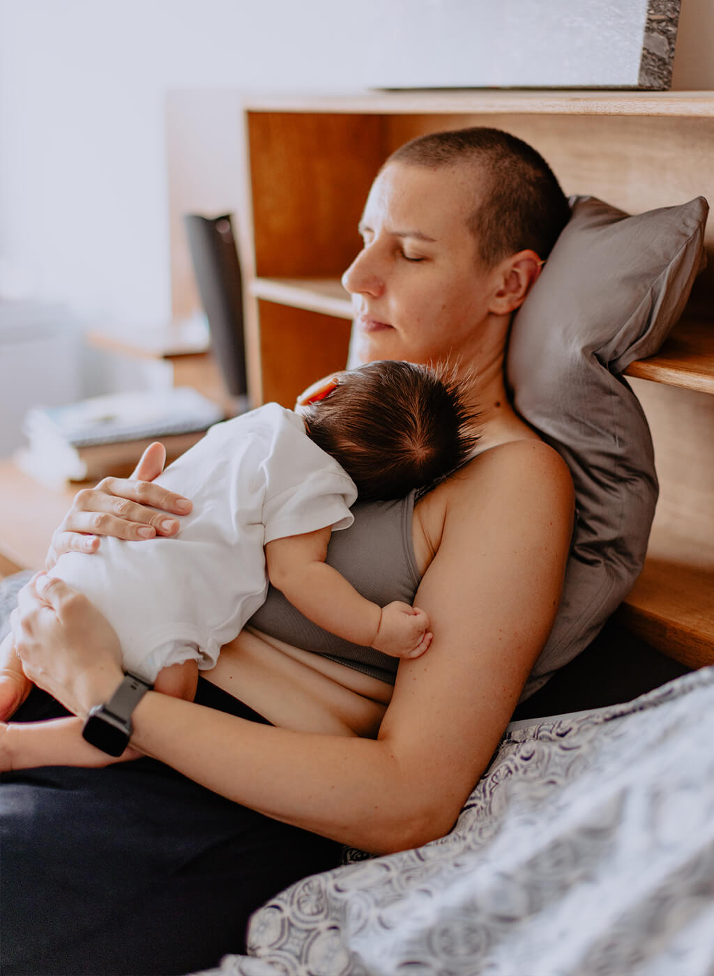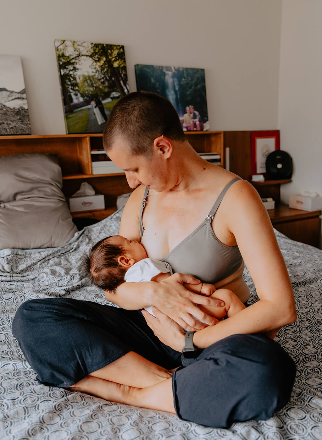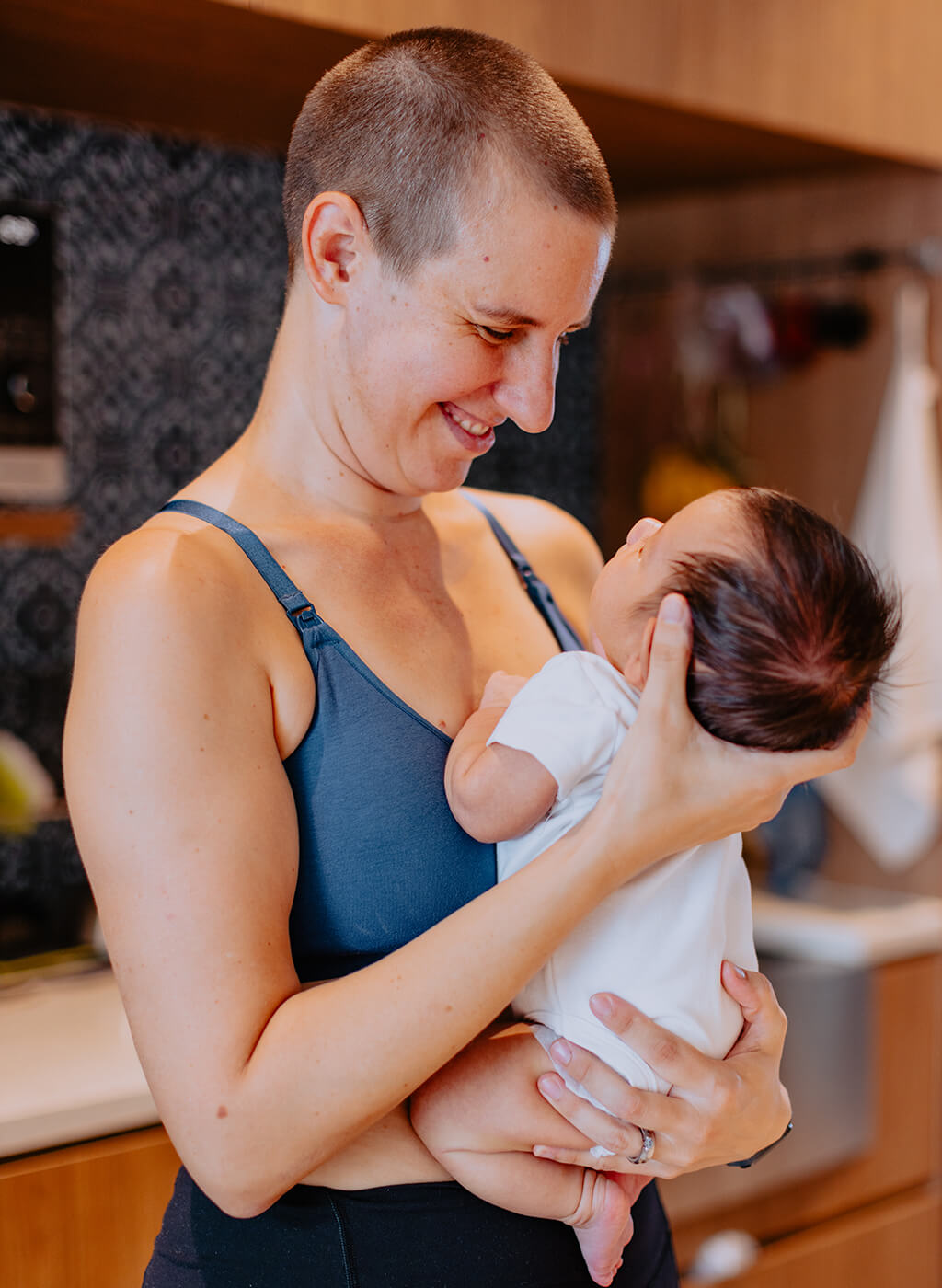 Holly is breastfeeding Alexander, wearing Lovemère Seamless Nursing Bra.