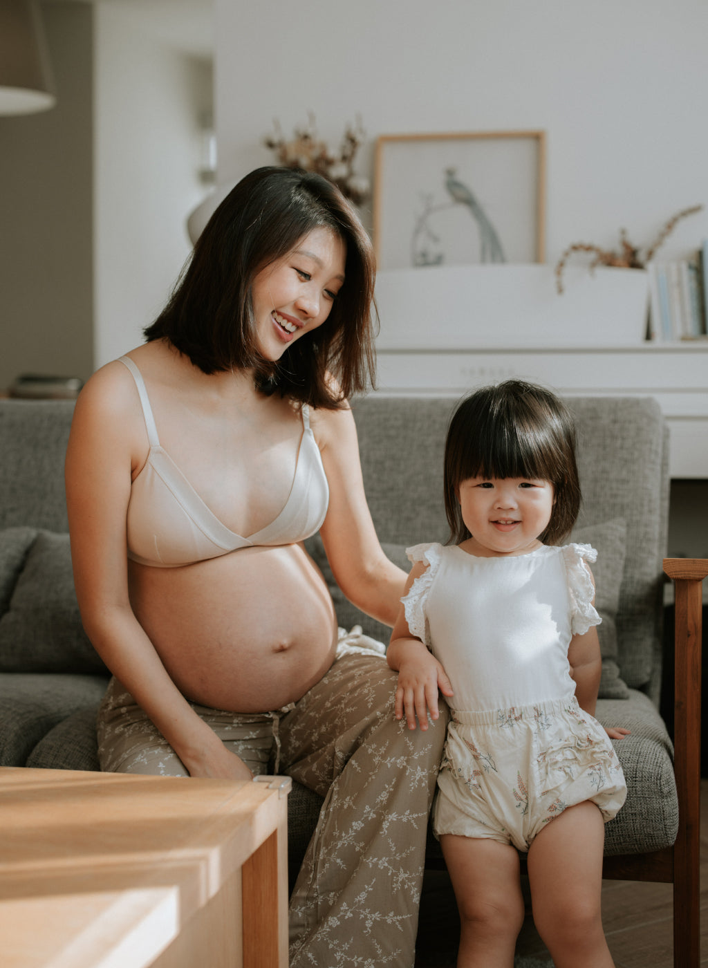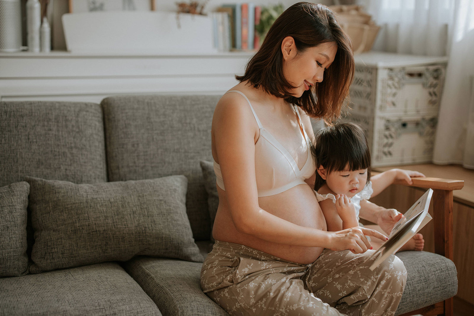 Sherlyn is wearing Brooklyn Triangle Bra at week 35, reading book to Thea.